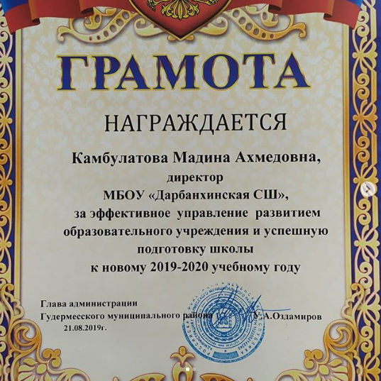 21.08.2019На ежегодной августовской конференции педагогических работников Гудермесского муниципального района, директор МБОУ "Дарбанхинская СШ" Камбулатова М.А. награждена почетной грамотой Главы администрации Гудермесского муниципального района, за эффективное управление развитием образовательного учреждения и успешную подготовку школы к новому 2019-2020 учебному году.
