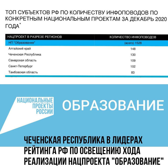 08.01.2021Дорогие друзья! Спешим поделиться радостной новостью! Наша республика вошла в топ рейтинга среди субъектов Российской Федерации по освещению хода реализации нацпроекта «Образование». Президент РФ Владимир Владимирович Путин ранее дал поручение о качественном освещении реализации нацпроектов в СМИ. Успех в выполнении данного поручения стал возможен благодаря всесторонней поддержке ДОРОГОГО БРАТА Главы ЧР, Героя России Рамзана Ахматовича Кадырова, который уделяет пристальное внимание системе образования нашей республики. Под его чутким контролем при реализации нацпроекта «Образование» в нашей республике ежегодно строятся десятки школ и решается проблема трехсменного обучения, материально-техническое состояние образовательных организаций соответствует самым современным условиям и обучающиеся имеют все возможности для обучения и развития. Сегодняшнее достижение и признание – яркий показатель эффективности политики, проводимой Главой республики в системе образования нашего региона и отличный стимул работать ещё эффективнее и качественнее.