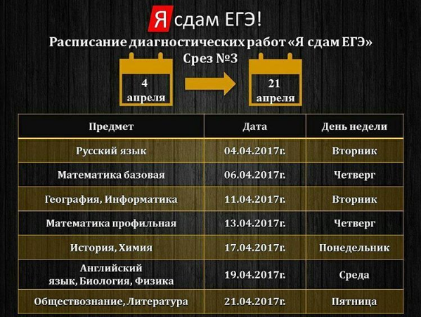 28.03.2017Дорогие друзья! Представляем вашему вниманию расписание третьего среза знаний в рамках проекта «Я сдам ЕГЭ!». Диагностические работы в рамках проекта «Я сдам ЕГЭ!» проводятся в образовательных организациях по месту обучения участников и в соответствии с общим расписанием занятий на втором и третьем уроке, но не ранее 8-30 по местному времени. Эффективность проведения диагностических работ с соблюдением основных требований к проведению ЕГЭ по объективности, в том числе запрет на использования средств связи как участниками диагностических работ, так и организаторами, даст корректное представление готовности обучающихся к прохождению ГИА.