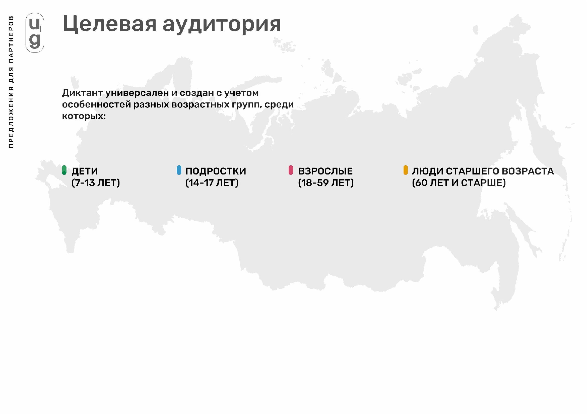 Диктант состоит из тестирований, разработанных с учетом разных возрастных категорий: для детей (10-13 лет), подростков (14-17 лет), взрослых (18-59 лет) и людей старшего возраста (60 лет и старше).