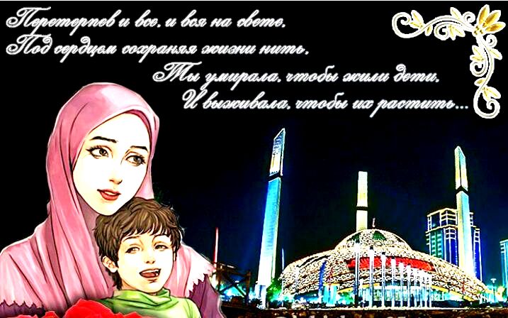 16.09.2018Дорогие коллеги, матери, сестра, бабушки и дочери! От всей души поздравлям вас с замечательным праздником - Днем чеченской женщины. Желаю крепкого здоровья, интересной работы, достойной заработной платы. Пусть в вашем доме всегда царит мир, любовь, теплота, радость, благополучие и добро. Пусть родные и близкие радуют заботой, пониманием, теплом и уважением.🌹🌹🌹🌹🌹🌹🌹Не переставайте помогать нам добрым словом и мудрым советом.С праздником!