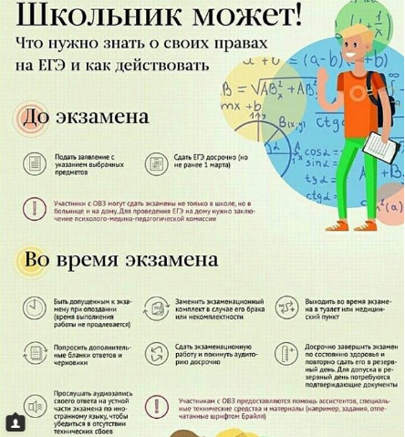 22.10.2018Что нужно знать о своих правах на ЕГЭ и как действовать. Единый государственный экзамен (ЕГЭ) является основной формой государственной итоговой аттестации выпускников 11 классов российских школ, а также вступительным экзаменом в вузы РФ. Какие возможности есть у участников ЕГЭ? Как учитываются особенности школьников с ОВЗ? Что делать, если не согласны с количеством выставленных баллов или порядком проведения экзамена? Ответы на эти вопросы - в инфографике "Социального навигатора" МИА "Россия сегодня", подготовленной совместно с Федеральной службой по надзору в сфере образования и науки @rosobrnadzor